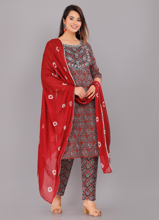 Red Cotton Kurta, Pant Set with Chiffon Dupatta