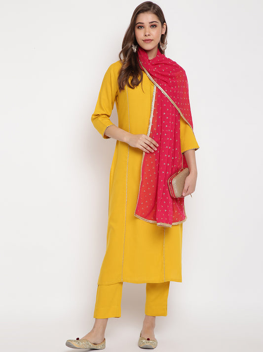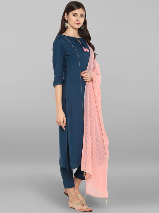 Turquoise Blue Rayon Kurta Set: Kurta, Pant, and Pink Dupatta Ensemble
